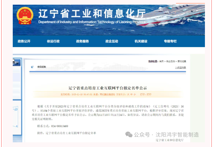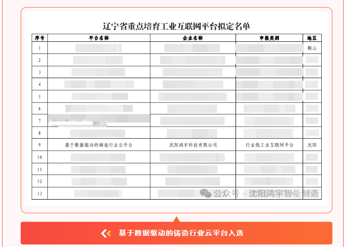 近日,辽宁省工业和信息化厅公布了2025年省重点培育工业互联网平台名单,沈阳鸿宇科技有限公司自主研发的“基于数据驱动的铸造行业云平台” 成功入选,被认定为行业级工业互联网平台。