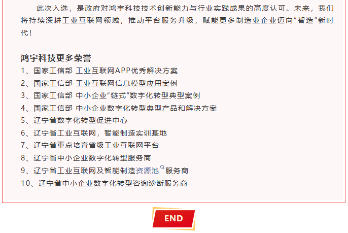 此次入选,是政府对鸿宇科技技术创新能力与行业实践成果的高度认可。未来,我们将持续深耕工业互联网领域,推动平台服务升级,赋能更多制造业企业迈向“智造”新时代!