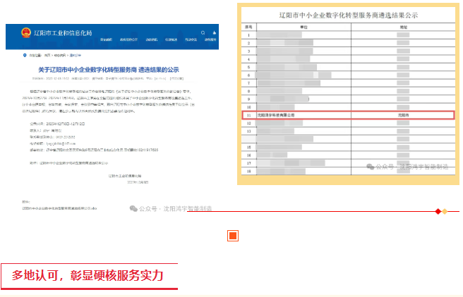 继斩获辽宁省、沈阳市、鞍山市、朝阳市中小企业数字化转型服务商资质后,沈阳鸿宇科技有限公司再传捷报!近日,辽阳市工业和信息化局正式公示遴选结果,公司凭借深厚的技术积淀、全域化的服务经验及定制化的解决方案,历经多轮严苛审核,成功入选辽阳市中小企业数字化转型服务商名单,标志着公司服务版图进一步扩大,区域数字化服务能力获得多地主管部门高度认可。