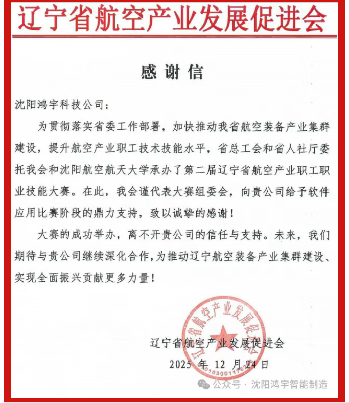 沈阳鸿宇科技有限公司作为第二届辽宁省航空产业职工职业技能大赛支持单位,公司对赛事的鼎力支持获辽宁省航空产业发展促进会诚挚致谢,其深度参与赛事、助力航空产业发展的责任与担当更获高度认可,为公司深耕航空领域再添奋进动力。