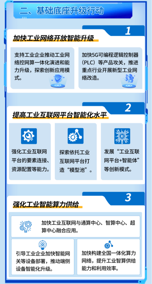 着力提升设施效能,实施基础底座升级行动。加快工业网络开放智能升级。支持工业企业推动工业网络控网算一体化演进和能力升级,推进重点行业开展新型工业网络改造。提高工业互联网平台智能化水平。强化工业互联网平台要素连接、智能分析、资源配置能力,探索依托工业互联网平台打造“模型池”,形成一批面向典型场景的工业智能体应用。强化工业智能算力供给。鼓励公共算力服务商向工业企业提供服务,加快智能网关等设备部署,推动端侧设备智能化升级,提升工业智算供给能力和利用效率。