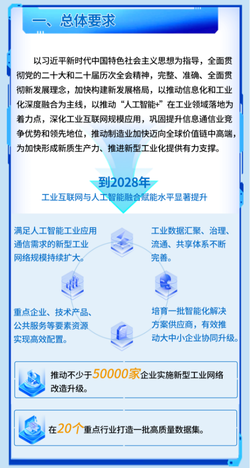 基础设施方面,满足人工智能工业应用高通量、低时延、高可靠、低抖动通信需求的新型工业网络规模持续扩大,在原材料、装备制造、消费品、电子信息等重点行业工业企业加快部署应用,推动不少于50000家企业实施新型工业网络改造升级。要素支撑方面,工业数据汇聚、治理、流通、共享体系不断完善,在20个重点行业打造一批高质量数据集。融合应用方面,面向重点产业链关键环节、典型场景,培育一批智能化解决方案供应商,有效推动大中小企业协同升级。产业生态方面,重点企业、技术产品、公共服务等要素资源实现高效配置。