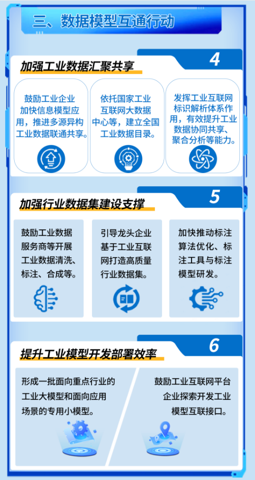 着力强化要素供给,实施数据模型互通行动。加强工业数据汇聚共享。推进信息模型、标识解析应用,建立全国工业数据目录,加快工业数据可信流通空间建设,推动多源异构工业数据联通共享。加强行业数据集建设支撑。鼓励工业互联网企业、工业数据服务商等联合开展工业数据清洗、标注、合成、评估,推动工业数据分类分级安全管理,打造一批高质量行业数据集。提升工业模型开发部署效率。加快打造一批面向重点行业的工业大模型、开发一批面向应用场景的专用小模型。鼓励工业互联网平台企业探索开发工业模型互联接口,优化大模型与小模型间协同效率。