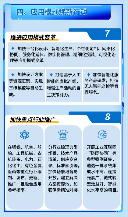 着力加快普及推广,实施应用模式焕新行动。推进应用模式变革。鼓励工业企业加快平台化设计、智能化生产、个性化定制、网络化协同、服务化延伸、数字化管理、精细化投融、可视化治理等应用模式变革,提升研发设计、生产制造、运维管理等环节智能化水平。加快重点行业推广。实施工业互联网与重点产业链“链网协同”工程,在钢铁、航空、电力、石化化工、医药等重点行业编制、发布、更新、推广一批融合应用参考指南。加快场景培育与开放,建立解决方案资源池,遴选工业互联网“链网协同”等典型案例,促进工业互联网和人工智能在重点行业、重点产业链融合应用。