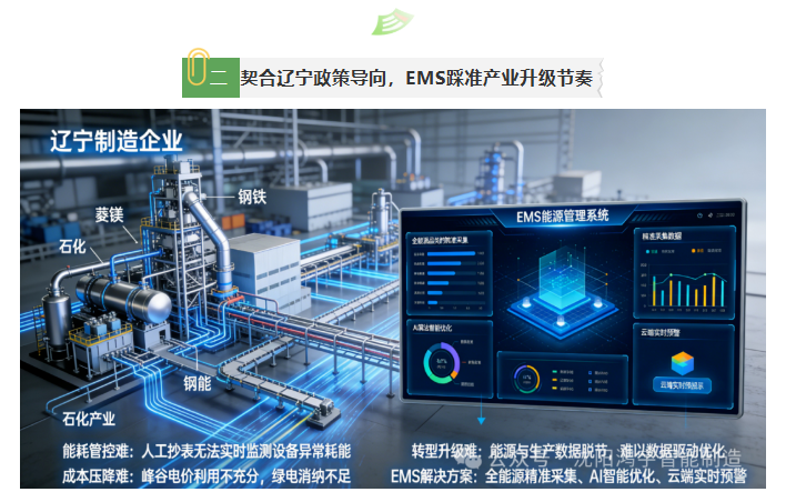 老工业基地的转型,从来不是简单的淘汰落后,而是在原有根基上的迭代升级。辽宁制造拥有雄厚的产业基础、完备的工业体系,而EMS能源管理系统,正是为这份基础插上“数字翅膀”,让传统制造企业焕发新活力。