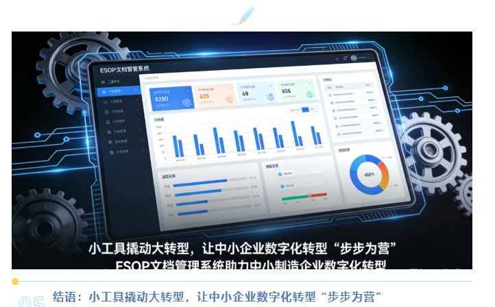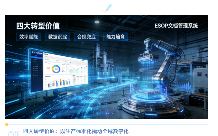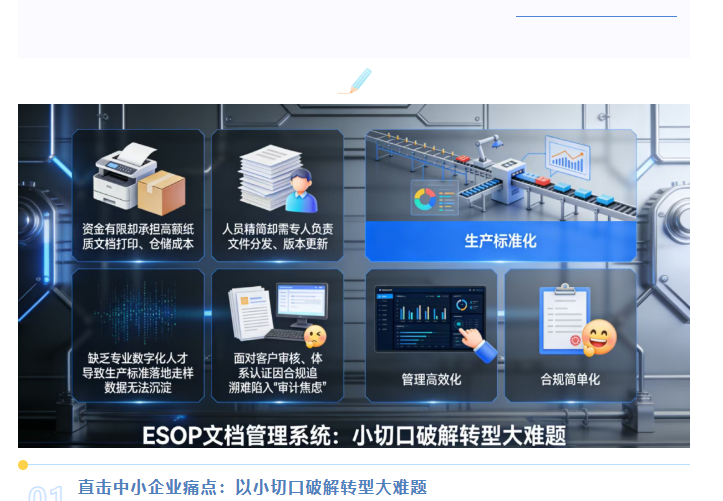 ESOP文档管理系统不仅是生产现场的“文档管理工具”,更是中小企业数字化转型的“入口级平台”,从生产端的标准化管理切入,为企业后续的数字化升级积累数据、沉淀经验、培养能力,实现“以点带面”的转型突破。