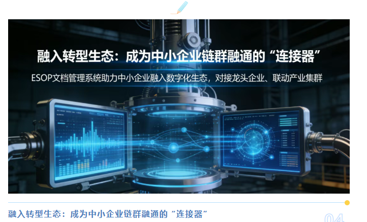 当前中小企业的数字化转型,正从“单打独斗” 走向“链群融通”,国家也在大力推动龙头企业牵引、产业集群联动的普惠式转型。ESOP文档管理系统不仅能服务于单个中小企业,更能成为产业链、产业集群数字化协同的基础工具,助力中小企业融入更大的数字化生态。