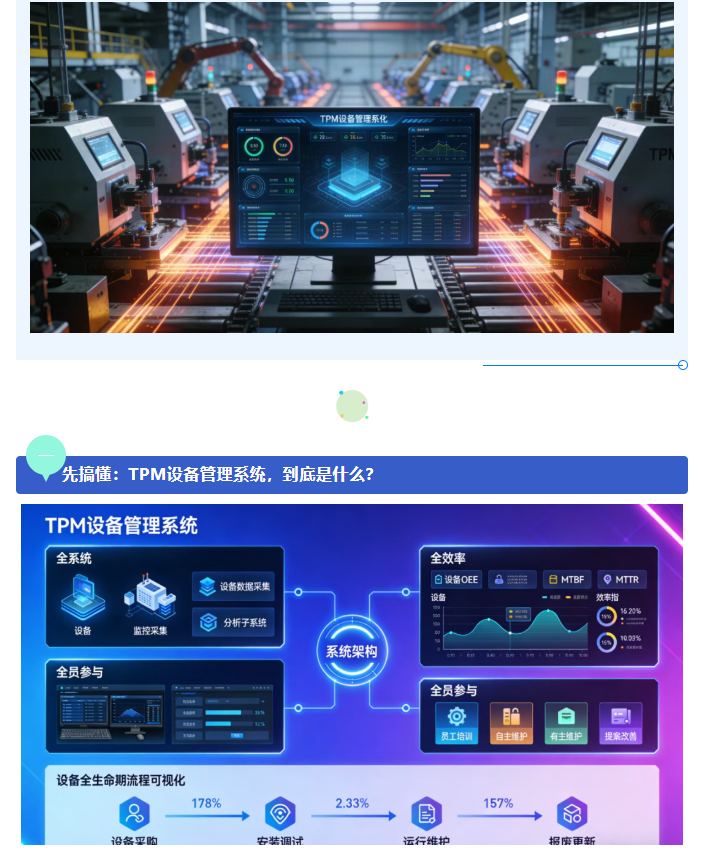 对于制造型企业而言,设备是生产的“心脏”,一旦故障停机易导致产线停滞、成本飙升等问题,传统“事后维修”的被动模式已跟不上精益生产节奏,而以“全员参与、预防为主”为核心的TPM设备管理系统,正是破解这一困境的“利器”,它将设备管理升级为“主动防控”,覆盖设备全生命周期、助力企业降本增效,今天就带大家全面解锁其核心价值。