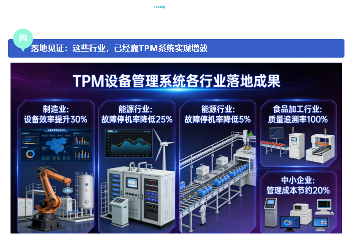 TPM设备管理系统并非“空中楼阁”,目前已广泛应用于制造业、能源、食品加工等设备密集型行业,落地效果显著:
