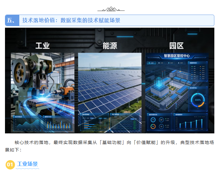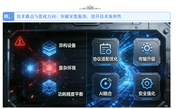 ·传输技术升级:引入5G-A技术,实现更低延迟(<10ms)、更高带宽、更强抗干扰能力,适配工业级高要求采集场景;同时推广无源物联网技术(如RFID、能量采集),解决户外无源设备的功耗问题。