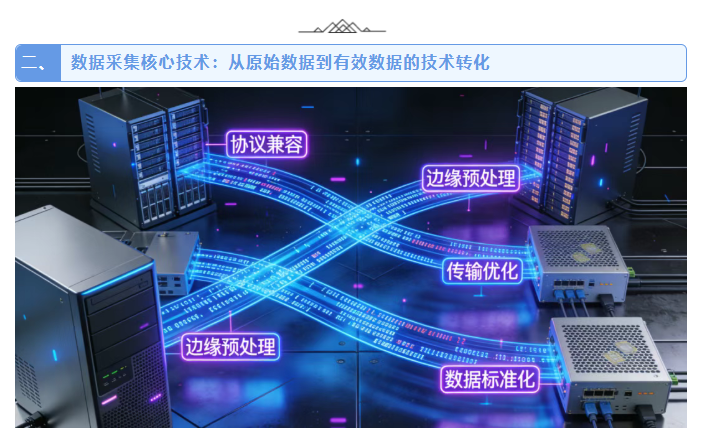 数据采集的核心痛点的是「异构设备兼容、数据冗余、传输不可靠」,对应的技术解决方案围绕「协议适配、数据预处理、传输优化」三大核心展开,实现「采得到、传得稳、存得准、用得上」的技术目标: