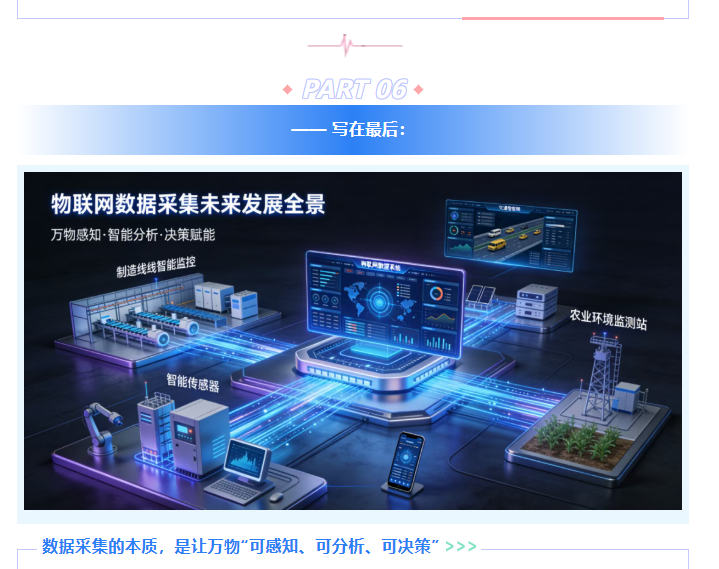 随着5G-A、无源物联网、AI自适应采集等技术的深度融合,物联网数据采集将朝着“更智能、更节能、更安全、更适配”的方向发展,未来,从工业制造的预测性维护,到城市治理的智能管控,再到民生服务的精准升级,都将依托更完善的数据采集技术,让“数据驱动”真正落地到每一个场景。