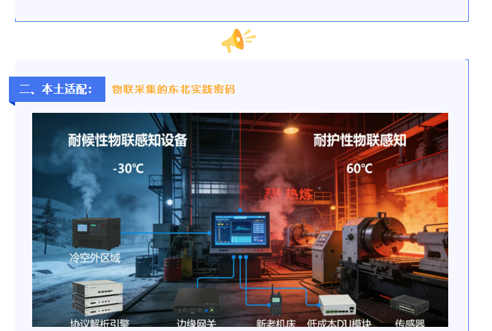物联网设备与数据采集并非“一刀切”的技术移植,而是适配东北制造业场景的定制化落地。针对东北工业场景的特殊性,物联采集技术形成了专属的实践路径: