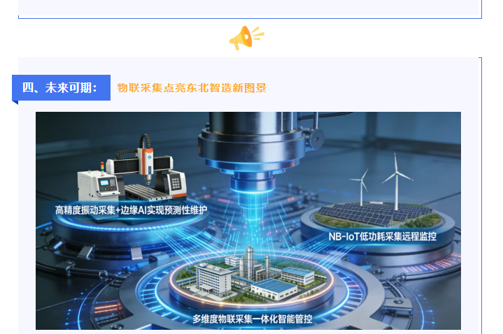 在装备制造领域,高精度振动采集+边缘AI将实现重型机床的全生命周期预测性维护,进一步降低非计划停机率;在能源重工领域,NB-IoT低功耗采集将实现风电、光伏、电网的全域远程监控,支撑能源调度的智能化优化;在园区管控领域,多维度物联采集将实现沈阳、大连等工业园区的能耗、安防、运维一体化智能管控,大幅降低运维成本。