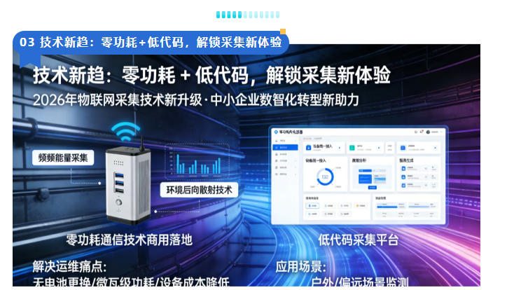 2026年物联网采集技术的新升级,更是为中小企业的数智化转型添砖加瓦,其中零功耗通信技术的商用落地,解决了中小企业的一大运维痛点。以往传感器、采集终端的电池更换,不仅耗时耗力,还会增加设备维护成本,而零功耗设备通过射频能量采集、环境后向散射技术,无需电池就能实现数据传输,功耗低至微瓦级,设备成本大幅降低,真正实现“一次部署,长期使用”,尤其适合中小企业的户外、偏远场景监测。
