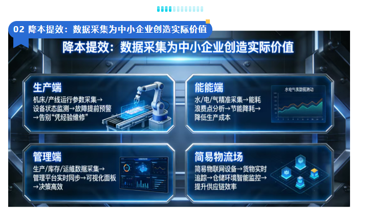 在数字经济的浪潮中,物联网设备与数据采集早已不是大企业的专属赛道,而是中小企业实现降本增效、弯道超车的核心抓手。从车间里的一台老旧机床,到园区的一套能耗监控系统,小小的传感器和采集终端,正为中小企业装上“数字眼睛”和“智能大脑”,让数据从“沉睡” 变为企业发展的核心资产。当下,物联网采集技术的轻量化、低成本、易部署升级,更是让中小企业能以低门槛踏上数智化转型之路,解锁发展新可能
