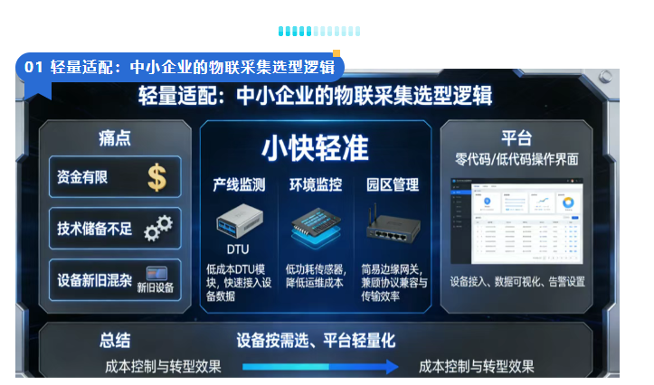 中小企业转型的痛点,在于资金有限、技术储备不足、设备新旧混杂,这就决定了物联采集设备和方案不能走“大而全”的路线,“小快轻准”才是核心准则。在设备选型上,无需追求高端顶配,而是要适配自身生产场景:产线监测选低成本DTU模块,实现设备数据的快速接入;环境监控用低功耗传感器,无需频繁更换电池,降低运维成本;园区管理搭简易边缘网关,兼顾协议兼容和数据传输效率。