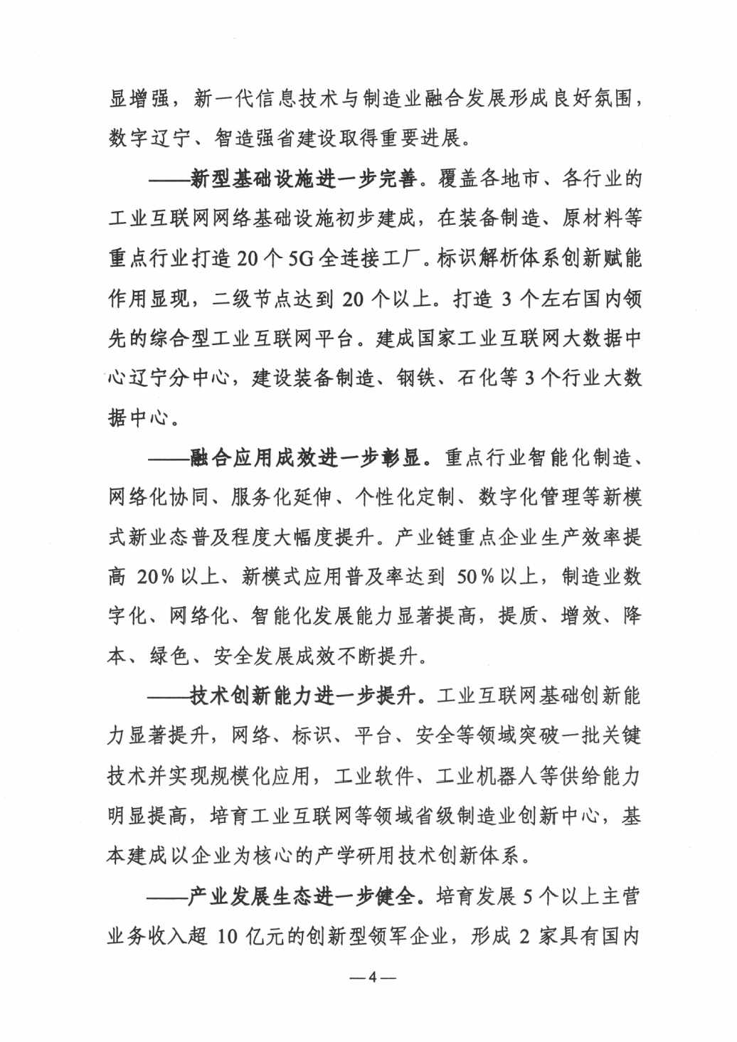 新型基础设施进一步完善。覆盖各地市、各行业的工业互联网网络基础设施初步建成,在装备制造、原材料等重点行业打造20个5G全连接工厂。标识解析体系创新赋能作用显现,二级节点达到20个以上。打造3个左右国内领先的综合型工业互联网平台。建成国家工业互联网大数据中心辽宁分中心,建设装备制造、钢铁、石化等3个行业大数据中心。