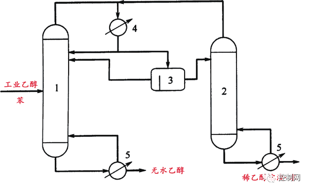 1:恒沸精馏塔;2:回收塔;3:分层器;