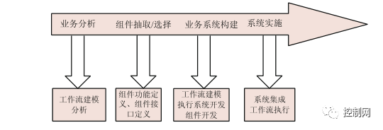 如图3所示为基于工作流的MES开发流程,即把MES业务过程逻辑从具体业务实现中分离出来,抽取出原子级的企业业务活动,并用组件来实现这些原子活动,以业务流程模型驱动这些活动的运行,从而实现企业业务和软件实现的全面集成。