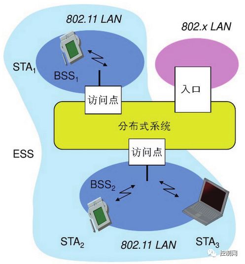 在Wi-Fi网络中,站点STA是指如手机、平板电脑、触摸屏等具有Wi-Fi通信功能、且连接到无线网络中的各类终端设备。BSS是基本服务集,其组成情况分由一个接入点和若干个站点组成、由若干个站点组成(最少两个)等两种情况。有接入点的BSS又被称为基础结构型基本服务集;无接入点的BSS又被称为独立型基本服务集,即AdHoc Network。ESS是扩展服务集,由一个或者多个BSS基本服务集串连在一起就构成的分布式系统。通过扩展服务集,可以扩展Wi-Fi无线网络的覆盖范围,达到覆盖整个制造业工厂的设备组。