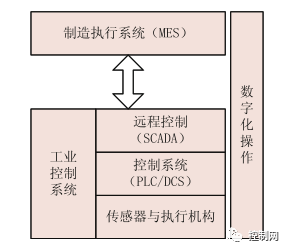 智能工厂的生产管理技术主要分为两个层次(如图2所示),即制造执行系统(MES)与工业控制系统,其中MES是把企业的生产计划同车间作业的工业控制系统联系起来,而工业控制系统则包括传感器与执行机构(包括数据采集器、条型码、各种计量及检测仪器、机械手等)、控制系统(PLC/DCS)、远程控制(SCADA)。另外,数字化操作则是智能工厂人机协调的最重要体现,包括移动/远程操作、增强/虚拟操作、健康/安全操作等最新技术。