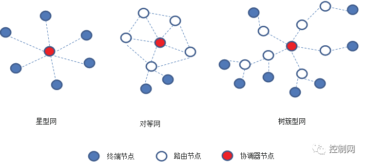 星型、树簇型和对等拓扑结构是ZigBee支持的三种类型,其网络拓扑结构如图5所示。图中,路由节点完成相关数据的路由,终端节点的信息在到达协调器节点之前一般要通过路由节点转发,协调器负责网络的管理。星型网络是最简单的一种,其各节点之间并不直接进行通信,数据信息都要通过协调器节点进行转发。对等网络中节点间彼此互连互通,其数据转发一般以多跳方式进行,每个节点都有转发功能。树簇型网络是一种最复杂的网络结构,由协调器节点、路由节点和终端节点组成。通常情况下,工厂内大面积的设备监测要通过对等网络完成,而星型网和树簇型网络是一对多点。
