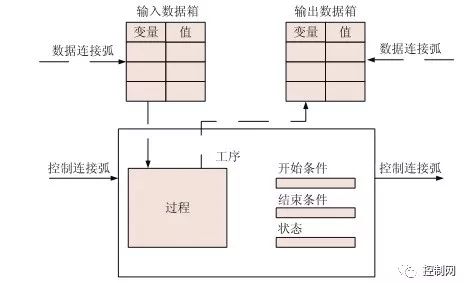 制造执行系统工作流的基本单位是工序,每一道工序的数据包括开始条件、结束条件、状态及加工数据。而对于工序之间的信息传递,则由控制连接弧和数据连接弧来控制。图5所示是制造执行系统的工序内部结构图。