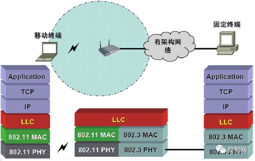 Wi-Fi 的全称是Wireless Fidelity,它采用一种11Mbps的无线标准——802.11b标准。Wi-Fi最大的优点就是较高的传输速度和很长的有效距离,分别可以达到11Mbps的传输速度和300m左右商用设备的传输距离。图6所示为Wi-Fi网络的协议栈,图7为Wi-Fi网络的结构。