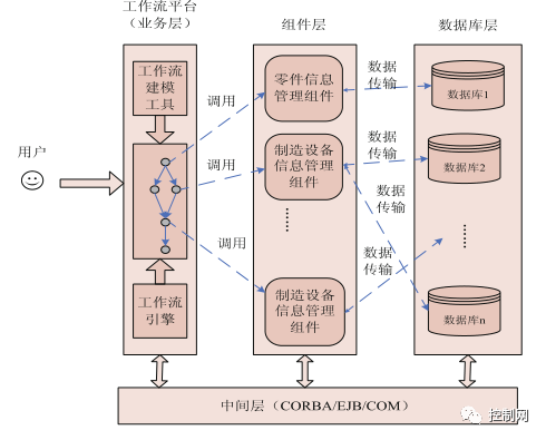 制造执行系统的工作流技术是一种能够有效的控制和协调复杂活动的执行,实现现场操作人员与ERP等管理应用软件之间交互的技术手段。采用工作流技术,可以把MES业务逻辑从具体的业务实现中分离出来。这种方法在进行企业实际应用时有着显著的优点,即可以在不修改硬件环境、操作系统、数据库系统、编程语言、应用开发工具、用户界面等具体功能模块实现方法的情况下,通过修改或重新定义过程模型来完成系统功能的改变或系统性能的改进。