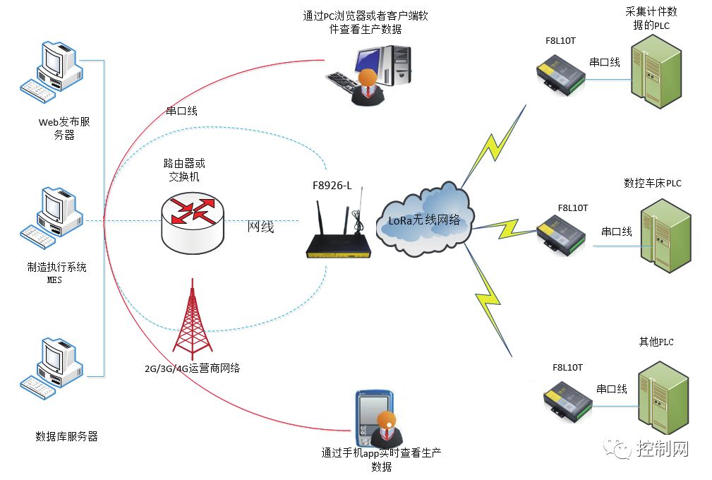 系统工作过程如下:LoRa模块作为物联网平台的核心器件,采集计数数据的PLC、数控车床PLC、其他PLC等通过F8L10T与LoRa物联网网络建立无线连接,LoRa物联网通过网关F8926-L再通过3G/4G网络等途径以TCP/IP协议将生产相关数据汇总到制造执行系统MES中。在服务器部署web平台,管理人员可通过浏览器登陆服务器查看生产数据,对产量产能进行实时监控、科学管理;同时可开发手机app,连接到服务器,从服务器下载生产数据,随时随地办公,方便快捷。