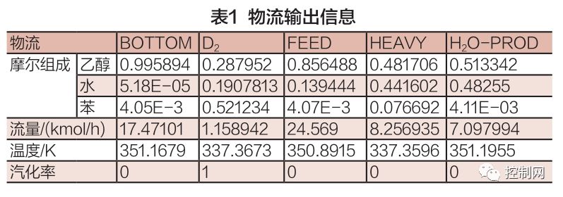 表1是根据输入信息后AspenPlus模拟计算的物流输出信息。