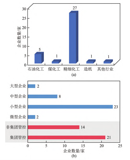图3(a)为本次评估的 35 家企业的行业分布情况,可以发现被评估企业的行业分布以精细化工企业为主,有27家,石油化工企业5家,煤化工和造纸行业各1家。评估过程充分考虑了企业所属行业的产品业务特点和相似智能制造建设案例。根据国统字〔2017〕213号《统计上大中小微型企业划分办法 (2017)》 的规定,对 35 家企业的规模进行划分,结果如图3(b)所示,可以发现被评估的企业以中小型企业为主,占比88.6%。