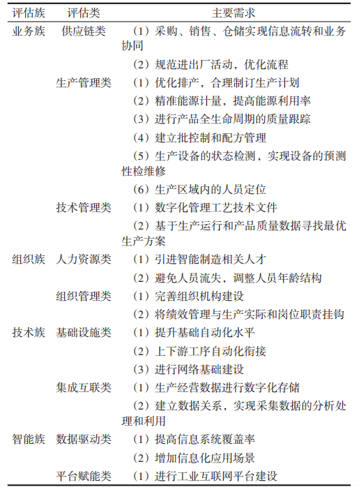 除此之外,经研究发现业务、组织和技术三个族内的评估内容项不能很全面、具体地体现企业在数据应用方面的准备度情况,而全面的数字化改造又是智能制造建设不可或缺的部分。因此,本模型增加第四个族“智能族”用于评估企业数据体系和支撑平台建设情况,主要围绕数据驱动和平台赋能两个类进行评估。