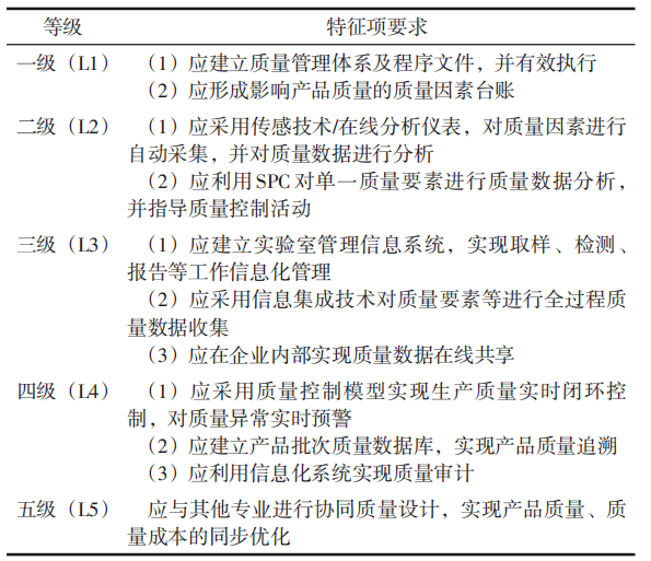 针对图2中的每一个评估域,在如何判定企业在该评估域所处的准备度等级方面,还缺乏明确的评估标准和依据。因此,本研究按照表1中所规定的五个准备度等级的要求,对每个评估域在每个等级应该具备的能力要求进一步细化,共建立了249个特征项要求。其中,以质量管理为例,总结设计了质量管理域从L1到L5的11个特征项要求,如表2所示。