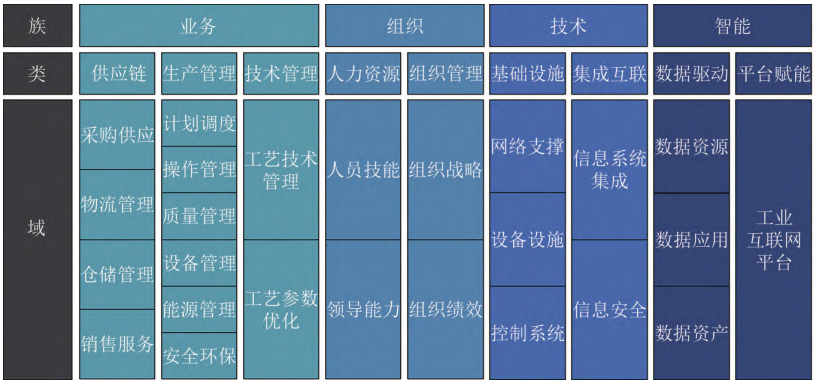 结合前人的研究成果,本文提出了流程工业智能制造准备度模型,如图 2 所示。模型为族、 类、域三层架构,包括 4 个族、9 个类和 25 个域,评估内容在涵盖了之前文献综述中所总结的主要内容项的基础上,结合我国流程工业的生产经营特点及智能工厂、智能制造相关建设标准与经验,进行了重新设计和组织。本模型首先将业务、组织和技术三个族列为主要的评估维度,业务族聚焦于企业供应链和产品生产的全生命周期,涉及产、 供、销等具体业务活动,包括供应链、生产管理和技术管理三个类;组织族偏重于企业的组织体系和人才队伍建设,衡量企业的组织体系、组织结构、人力资源管理等方面是否满足企业智能制造的建设需要;技术族则更多用于识别企业在应用自动化和信息化技术所具备的基础设施、系统集成和信息安全方面的条件。