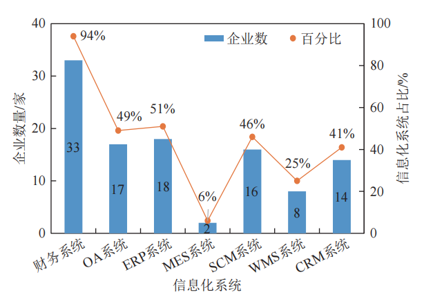 评估企业信息化建设情况统计如图7所示,可以发现诊断企业中建有财务系统的企业数量最多, 有33家,占比94%;建有MES系统的企业数量最少,有2家,占比6%,另有4家企业正在进行MES系统的实施;建有SCM系统的有16家,占比46%;建有ERP、CRM、SCM和OA系统的企业数量相接近。结合图3(b)评估企业的企业规模进行分析,发现集团管控型企业和大中工业企业出于资产管理、质量管理、业务协同的需要,对ERP、SCM、CRM、OA、MES、WMS建设需求较为强烈;小微工业企业由于规模小、装置少、组织管理简单,导致上述系统的建设投入产出效果不明显,建设意愿相应较低。小微工业企业更愿意在基础自动化、安全环保设备等方面进行投资。整体来说,本次评估企业对生产管控类的信息化系统,如MES、WMS 等,建设相对薄弱,对经营管理类信息化系统,如ERP、OA、SCM、CRM等,建设相对较完善。