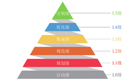 图1展示了准备度等级的划分,本模型最终评估判定的企业智能制造准备度等级参考《智能制造能力成熟度模型》(GB/T 39116—2020)的等级划分,将评分高于0.8分的企业从高到低依次分为引领级、优化级、集成级、规范级和规划级,未达到0.8分的企业归为启动级。