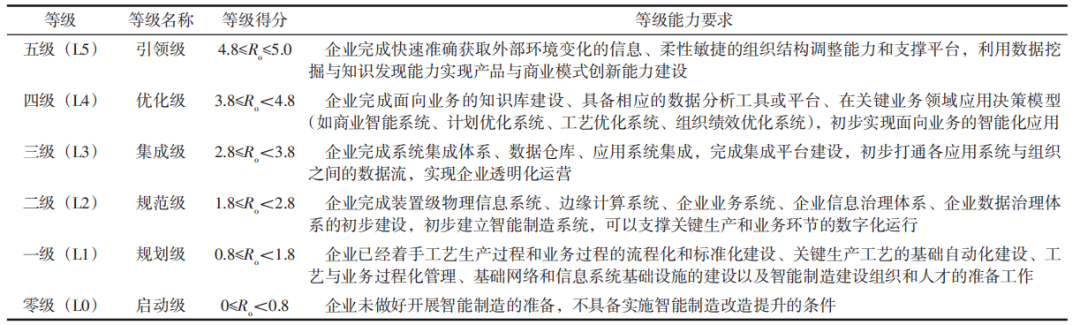 表1展示了各等级的等级能力要求,规划级要求企业对业务进行流程化和标准化的设计;规范级要求企业开始使用信息化手段对核心业务进行管理;集成级要求企业对系统和装备等开展集成,并且实现核心业务间的数据共享;优化级要求企业通过对数据的分析将数据进一步转化成模型和知识,并且可以在核心业务活动中进行预测和优化;引领级作为智能制造等级的最高级别,更多程度上强调持续的优化和创新,创造新的生产经营模式。表1中规定的智能制造准备度等级能力要求是逐级评估的,企业只有满足了低等级的准备度能力要求,才可以进行更高等级的评定,也就是说企业的智能制造准备度评定为某一等级时,该等级以下的准备度等级能力要求也需要同时满足。