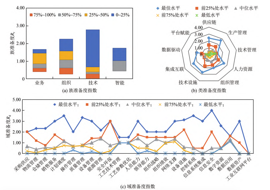 另外,所有评估企业都没有搭建工业互联网平台,在平台赋能和数据驱动方面有较大的提升空间。在图5(c)域准备度指数中可以发现前 25% 的企业在采购供应、安全环保和数据应用域的建设水平非常接近,说明企业在进行智能制造能力提升改造过程中更倾向于优先发展这些业务域。另外,前25%~50%的企业在计划调度、操作管理、质量管理、能源管理、网络支撑和控制系统域的建设情况很接近,说明这些业务域在企业日常生产运营中有较强的支撑作用。本次评估过程中通过现场诊断35家企业各个业务域的实际情况进行举证,逐级确认域、类、族的准备度打分,最终的打分结果和表1中的能力要求及企业实际现状进行了对比验证,并得到了被评估企业的确认,验证了模型的可用性。