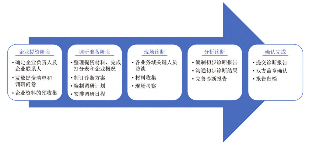 本次智能制造准备度评估工作采用问卷调研和现场诊断结合的方式,保障评估结果更加准确和真实地反映企业现状。评估工作分为企业提资、调研准备、现场诊断、分析诊断和确认完成五个阶段,如图4所示,这也是使用本模型开展智能制造评估的通用流程。企业提资阶段,向被评估企业发放调研问卷,并且进行工艺、运营情况等资料收集工作;调研准备阶段,根据企业问卷情况进行初步准备度指数计算,并制订现场诊断的计划;现场诊断阶段通过对各评估域相关负责人的访谈和对企业各部门的现场取证,逐步确认各特征项评估结果的准确性,并对相关评估域的评估结果进行修正;分析诊断阶段主要进行诊断报告的编写;确认完成阶段与企业负责人完成最终确认。具体评估流程见图4。