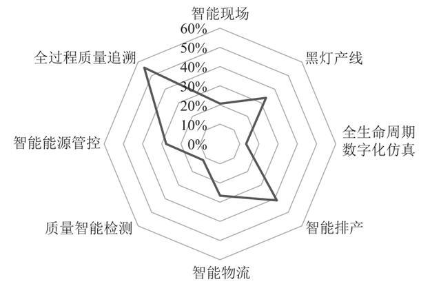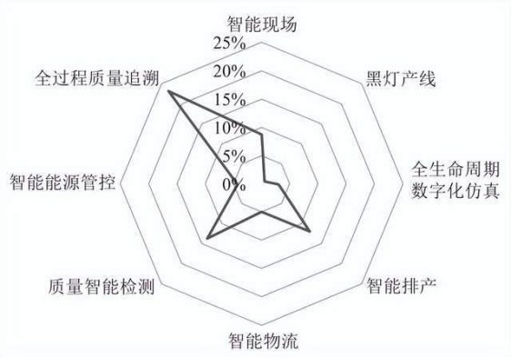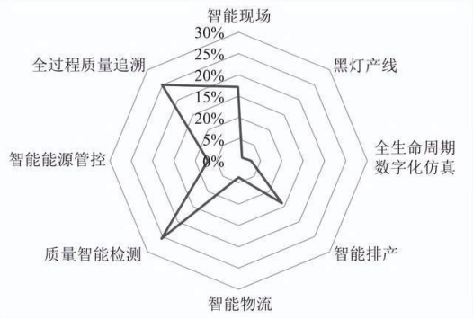 调研的机械装备制造领域948家生产单位建设有83条智能单元/产线,全生命周期数字化仿真技术应用仅3%,智能排产技术应用仅为12%,智能物流应用仅为5%,应用质量智能检测技术的为14%,实现智能能源管控的仅为4%,开展全过程质量追溯的有23%,有869台设备实现了远程运维/预测性维护。从调研数据来看,机械装备制造企业智能制造发展还很薄弱,应强化智能制造推动企业数字化转型工作。如图3所示。