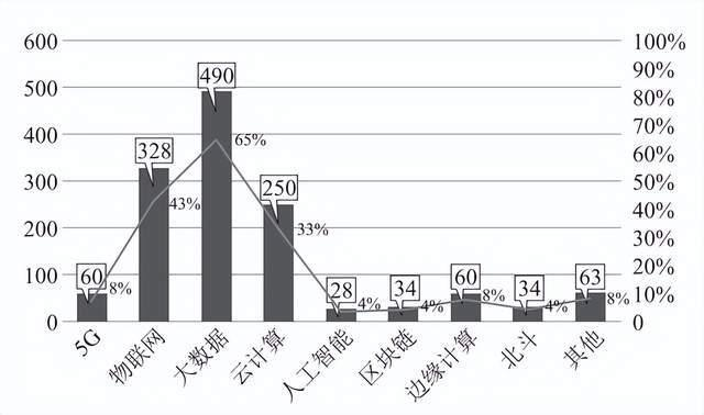 从图可见,有490个案例应用了大数据技术,有328个案例应用了物联网技术。边缘计算、5G、区块链、人工智能技术应用的案例数较少,仍处于试点示范阶段。