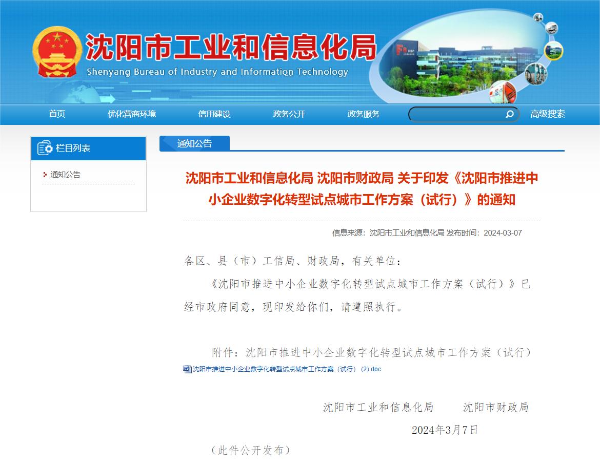 根据《财政部工业和信息化部关于开展中小企业数字化转型城市试点工作的通知》(财建〔2023〕117号)精神,沈阳市中小企业数字化转型城市试点工作专班加强组织领导和统筹协调,强化顶层设计,健全工作体系,项目化、清单化、工程化推进试点工作落实。