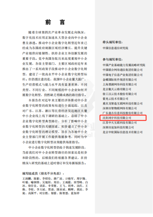 2024年5月8日,由工业互联网产业联盟(AII)组织发起、中国信息通信研究院牵头、沈阳鸿宇科技有限公司参编的《中小企业数字化转型研究报告(2023)》正式发布。