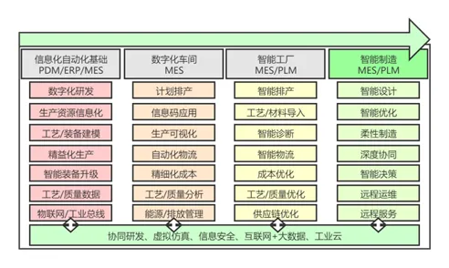 ◉ 基础设施层:企业首先应当建立有线或者无线的工厂网络,实现生产指令的自动下达和设备与产线信息的自动采集;形成集成化的车间联网环境,解决不同通讯协议的设备之间,以及PLC、CNC、机器人、仪表/传感器和工控/IT系统之间的联网问题;利用视频监控系统对车间的环境,人员行为进行监控、识别与报警;此外,工厂应当在温度、湿度、洁净度的控制和工业安全(包括工业自动化系统的安全、生产环境的安全和人员安全)等方面达到智能化水平。