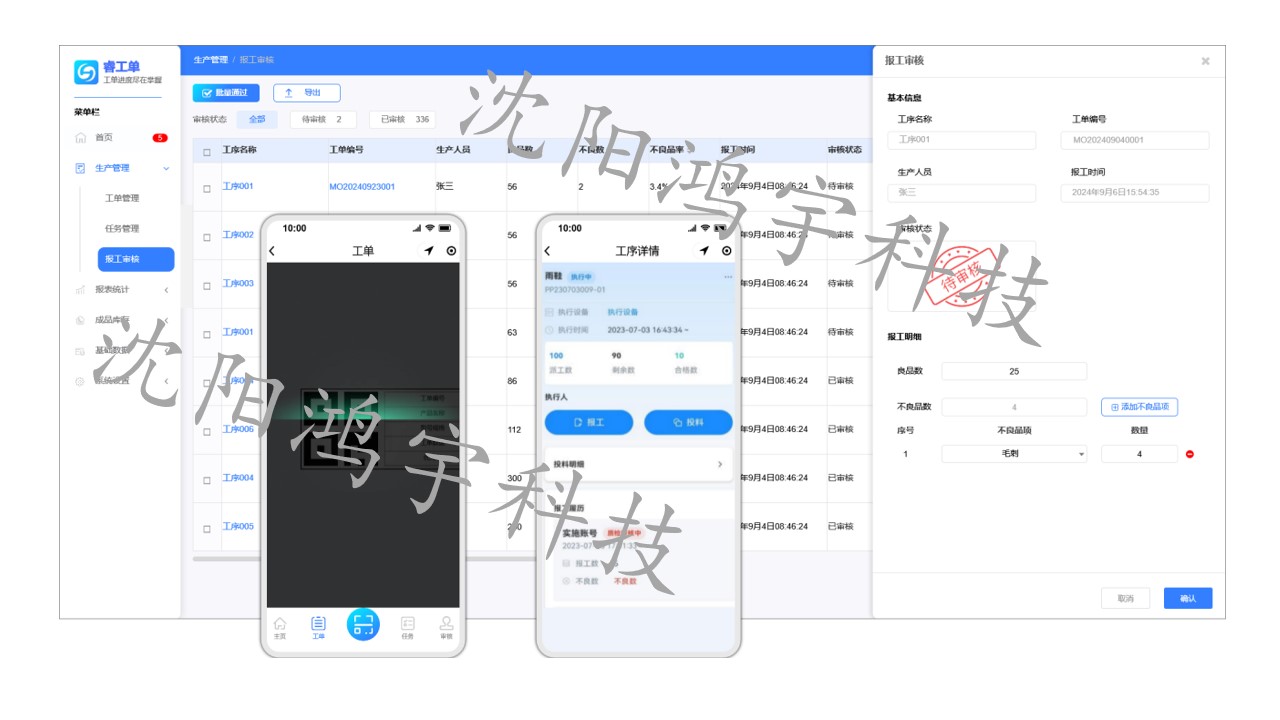 系统提供简单高效的报工方式,可以在PC端和移动端报工,移动端支持扫码报工,质检员收到审核申请后审核良品数和不良数,完成后更新工单进度和员工绩效。