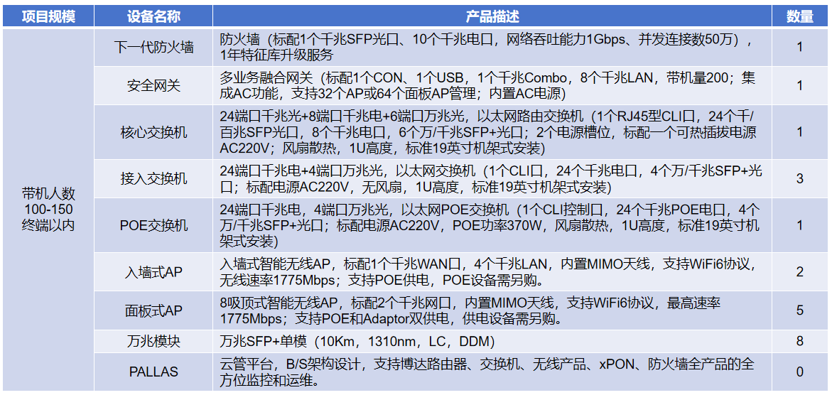 网络设备选型建议方案(带机人数100-150终端以内)