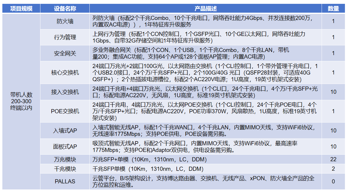 网络设备选型建议方案(带机人数200-300终端以内)