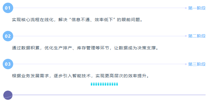 辽宁中小企业的数字化转型,不该追求“一步到位”,而应秉持“长期主义”心态,按照“在线化-数据化-智能化”的节奏稳步推进: